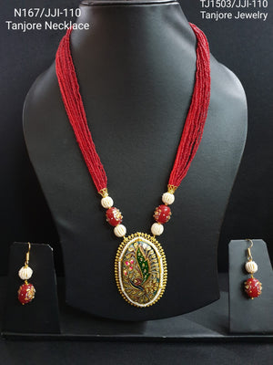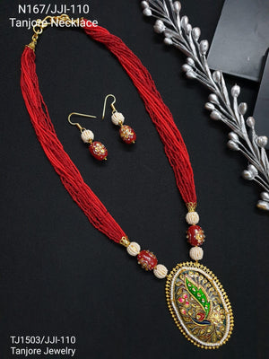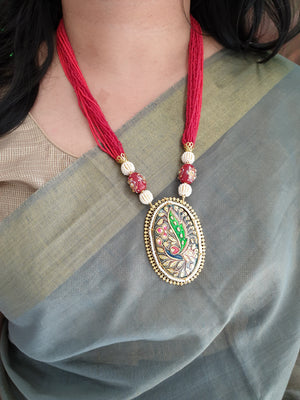 Elevate your style with our Red Seed Beaded Tanjore Work Pendant Set, elegantly complemented by coordinating earrings. This exquisite set showcases traditional craftsmanship and timeless elegance