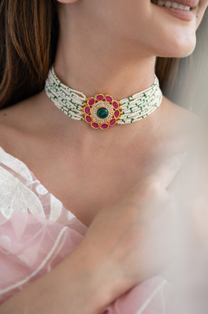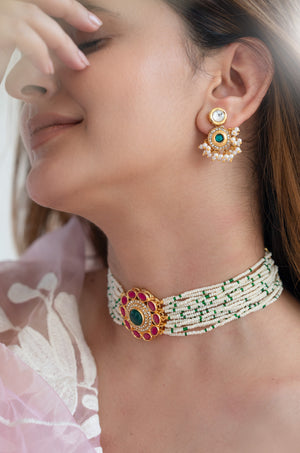 Turn heads with this handcrafted choker necklace set, featuring multiple rows of lustrous beads, a stone pendant adorned with beads. Perfect for weddings, festive occasions, and gifting.