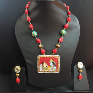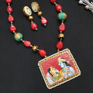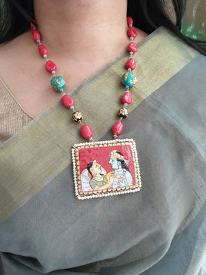 Red Stone Single Layer Handpainted Radha Krishna Pendant Set