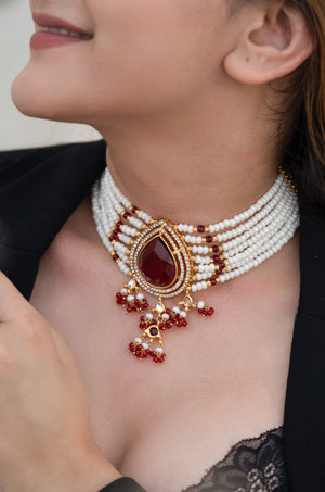 Turn heads with this handcrafted choker necklace set, featuring multiple rows of lustrous beads, a stone pendant adorned with beads. Perfect for weddings, festive occasions, and gifting.