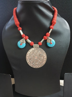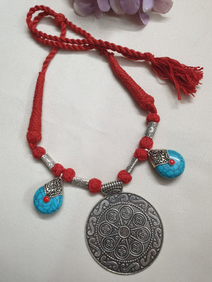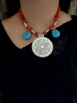 Red Thread Oxidised Silver Turquoise Necklace Set