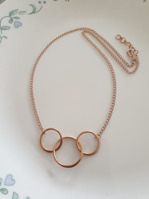 Three-Linked Circle Necklace. This beautiful and simple Three Linked Circle Necklace features a handmade link made of Three graduated circles from small, to large in the middle, back out to small on a rose gold finished chain with a lobster clasp closure.