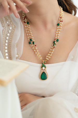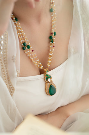 Elevate your festive look with this luxury handcrafted beaded necklace featuring a multi-layer pearl bead chain, adorned with green and ruby accents, and a gold-plated peacock-inspired pendant embellished with a bold green teardrop gemstone.