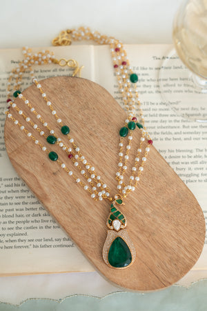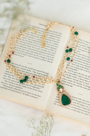 - Multi-layer pearl beaded chain with green & ruby accents