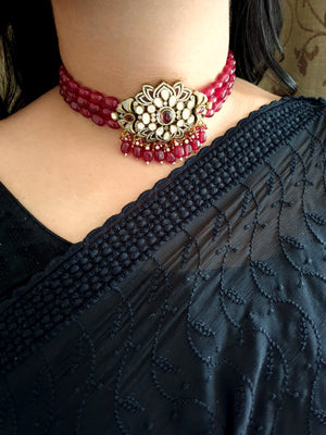 An elegant designer Kundan maroon-stone choker necklace with the most stunning festoon. The perfect accessory for your occasion. This necklace is handcrafted with love