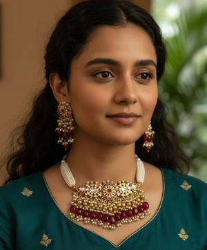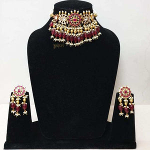 Ruby & Pearl Beads Stone Floral Kundan Choker Necklace With Earrings