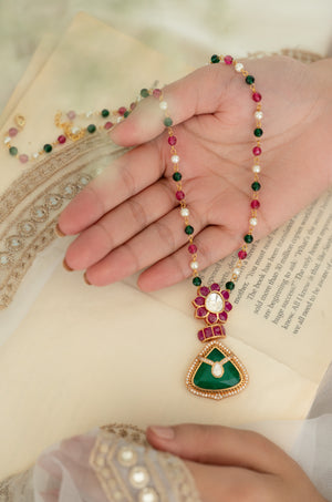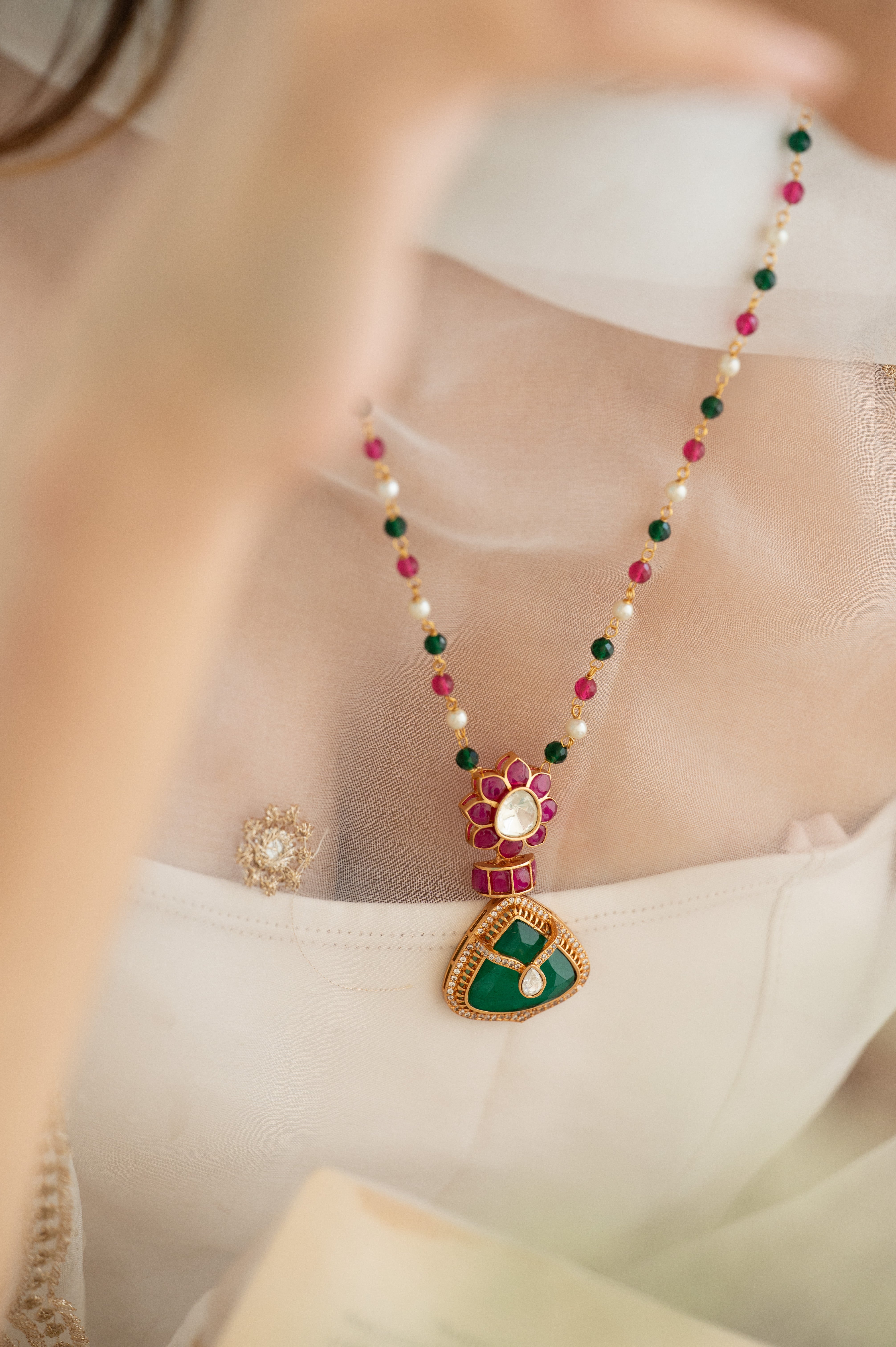 Celebrate tradition with elegance in this handcrafted festive kundan pendant necklace. Featuring a floral kundan motif with ruby-red accents, a bold emerald green triangular pendant with crystal detailing, and a pearl-beaded chain interlinked with ruby & green beads, this necklace is a true work of art.