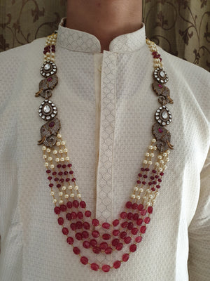 Ruby Stone And Pearl Beaded Groom Necklace with AD Kundan Elephant Brooch