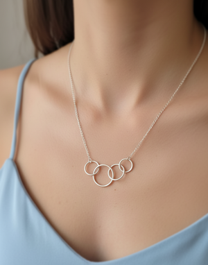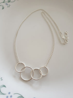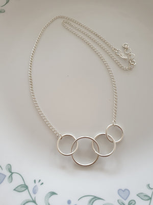 Four-Linked Circle Necklace. This beautiful and simple Four Linked Circle Necklace features a handmade link made of four graduated circles from small, to large in the middle, back out to small on a silver finished chain with a lobster clasp closure.