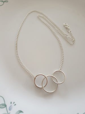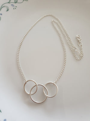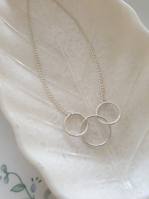 Three-Linked Circle Necklace. This beautiful and simple Three Linked Circle Necklace features a handmade link made of Three graduated circles from small, to large in the middle, back out to small on a silver finished chain with a lobster clasp closure.