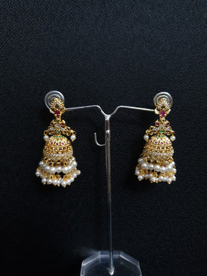 An elegant pearl-beaded Jhumki earring with the most stunning festoon. The perfect accessory for your occasion. These earrings are handcrafted with love