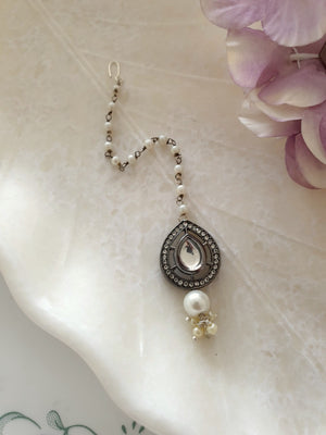 Silver Teardrop Kundan Polki Pearl Beaded Maang Tikka