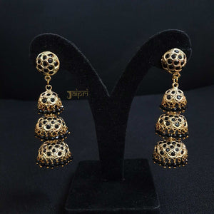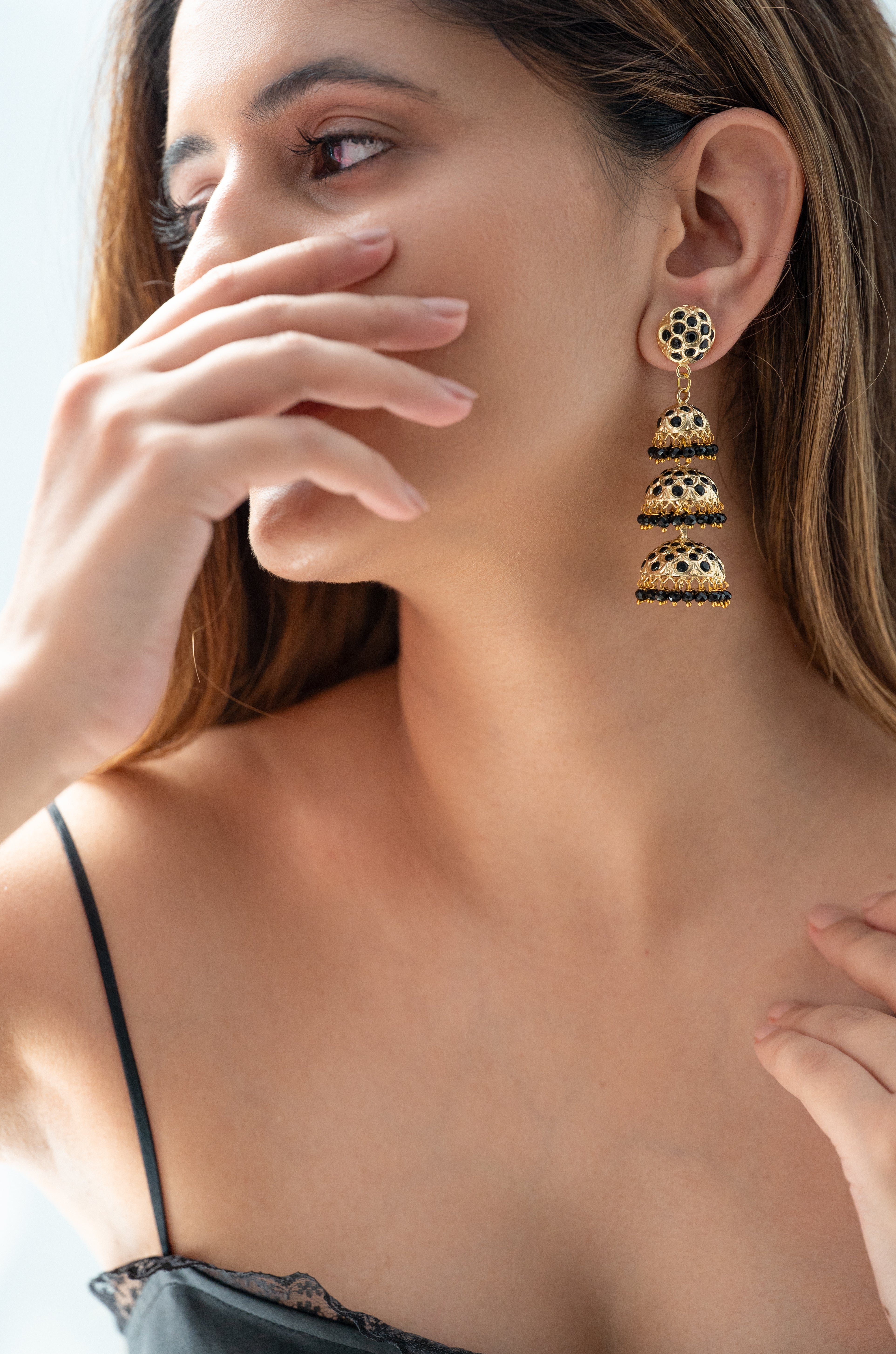 An elegant black stone gold three jhumki earrings with the most stunning festoon. The perfect accessory for your occasion. This earrings is handcrafted with love