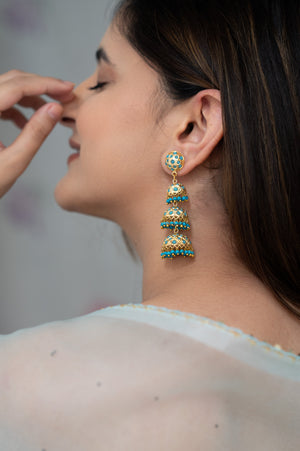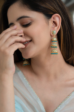 An elegant turquoise stone gold three jhumki earrings with the most stunning festoon. The perfect accessory for your occasion. These earrings is handcrafted with love