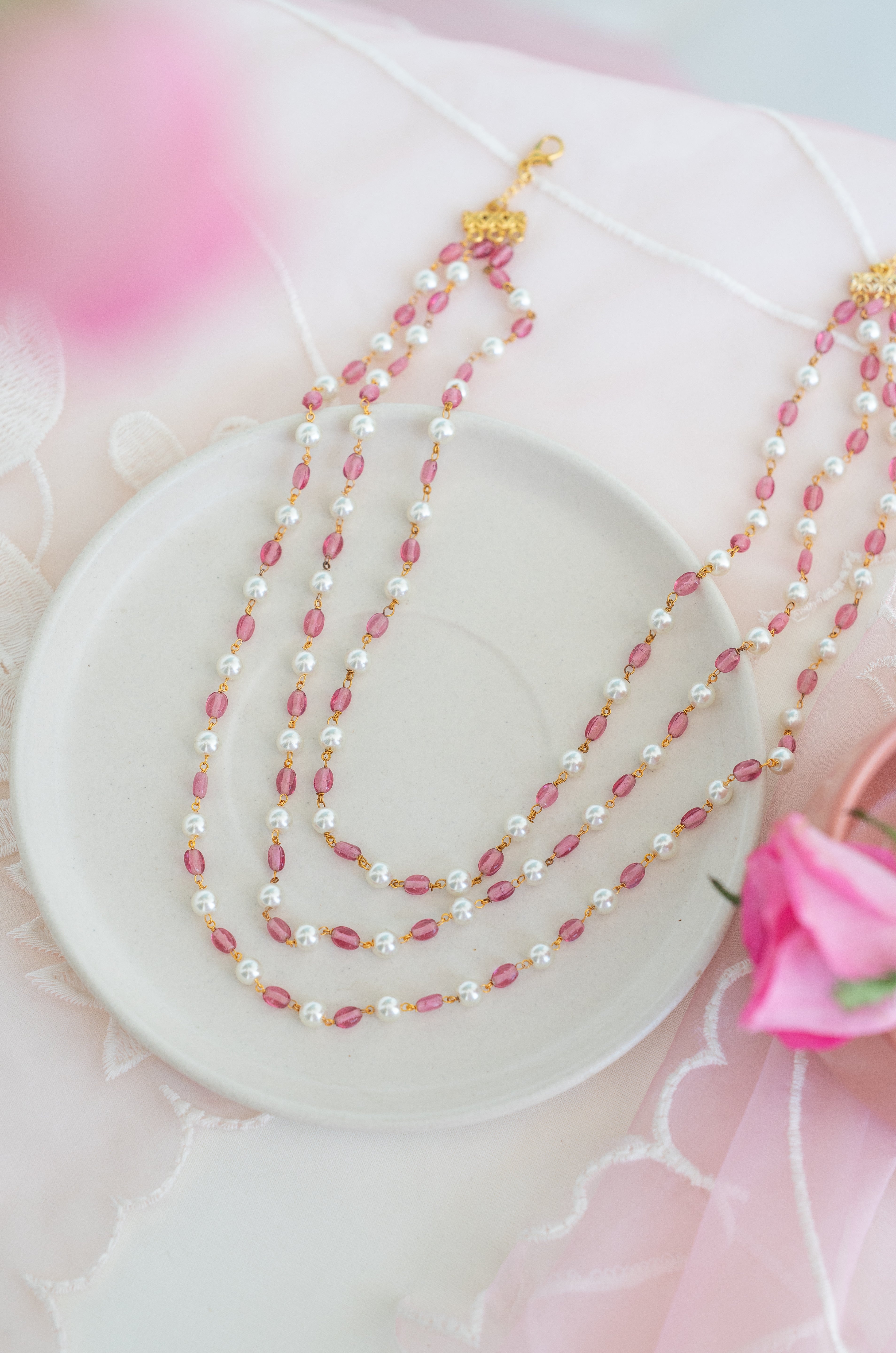 Celebrate tradition with elegance in this handcrafted festive necklace. Featuring a pearl and tourmaline accents, and a pearl-beaded chain interlinked with pearl & tourmaline beads, this necklace is a true work of art.