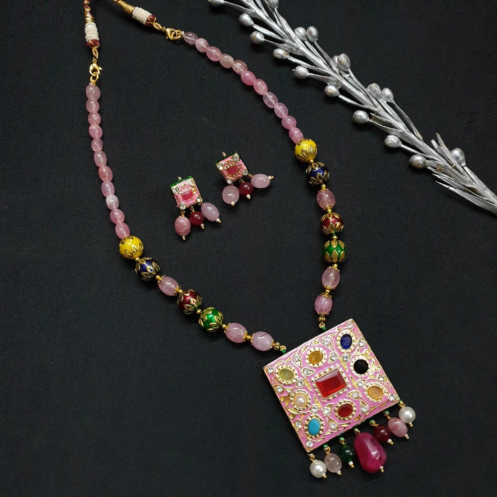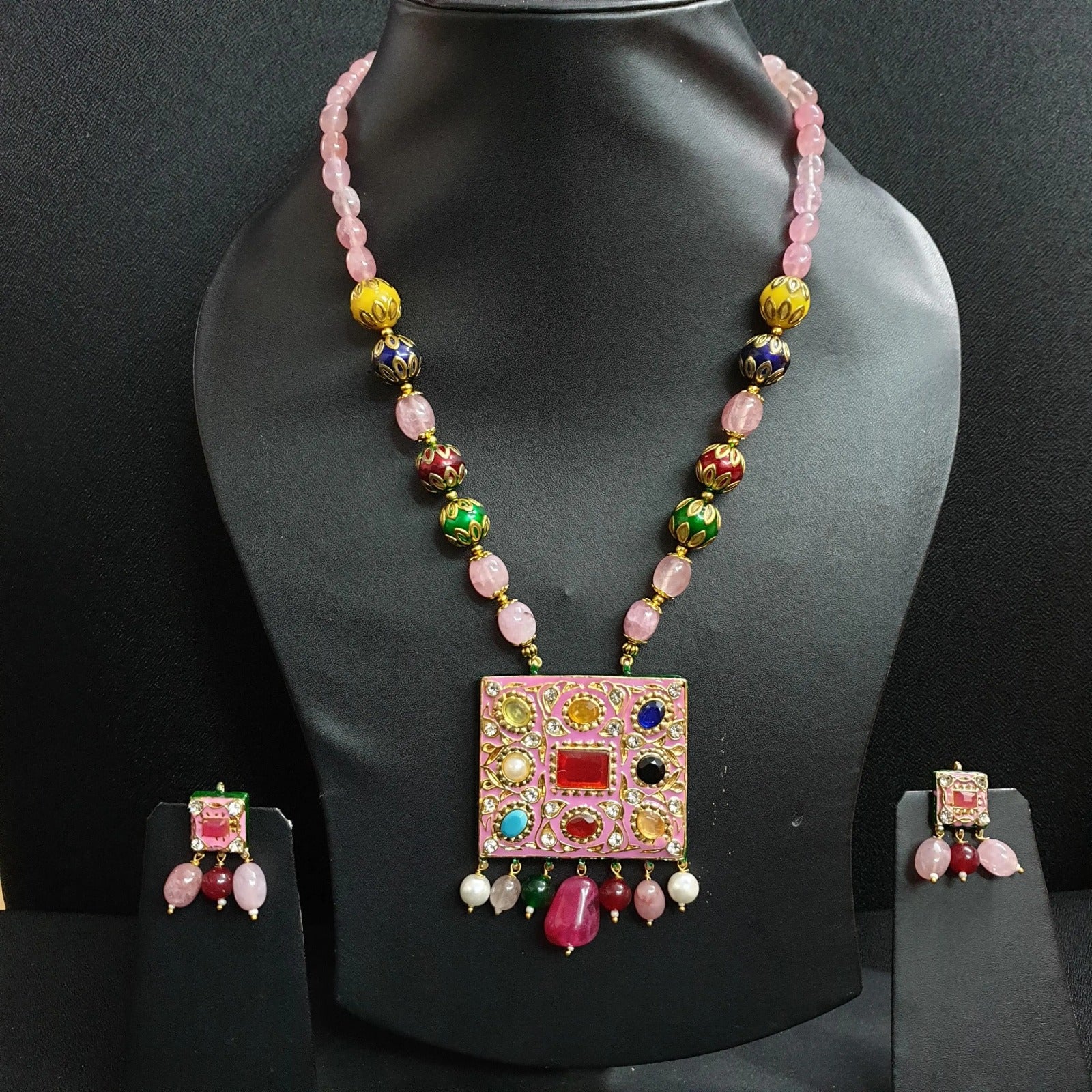 Traditional Navratana Pink Stone Pendant Necklace