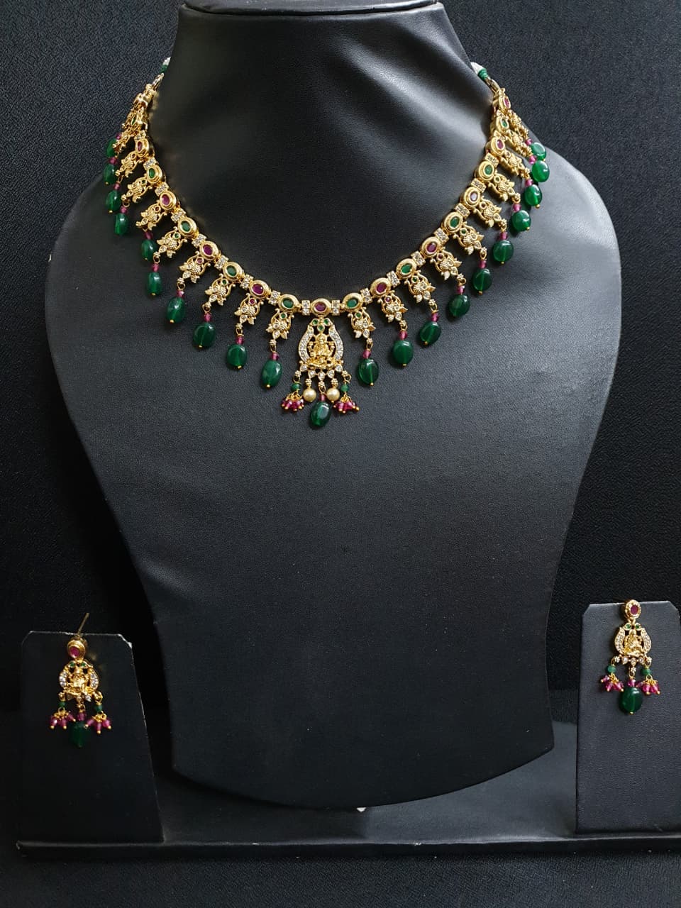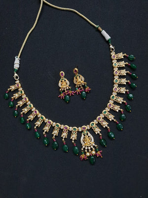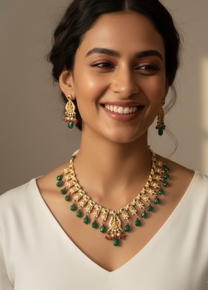Expertly crafted in a gold finish, this statement necklace features a divine Lakshmi pendant, intricate temple detailing, and a rich combination of deep emerald-toned beads and elegant pearl drops. The matching earrings complete the look, making it an ideal choice for South Indian bridal wear and wedding ceremonies.