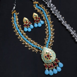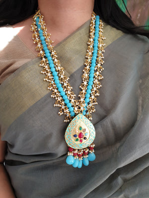 An elegant turquoise beads stone meenakari pendant with the most stunning festoon. The perfect accessory for your occasion. This necklace is handcrafted with love