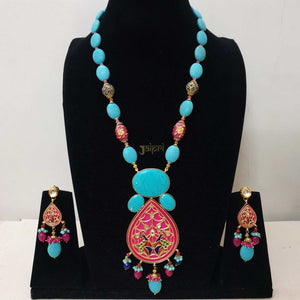 Turquoise Beads Stone & Meenakari Fusion Pendant With Earrings