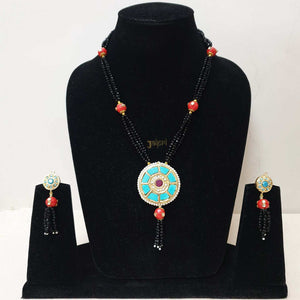 Turquoise & Black Stone Floral Fusion Pendant With Earrings