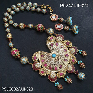 Turquoise Jadau Work Long Fusion Pendant Set With Earrings