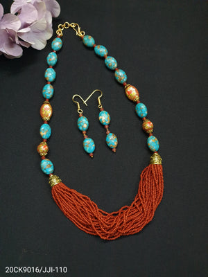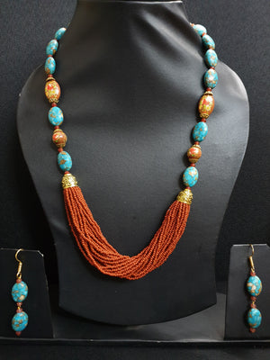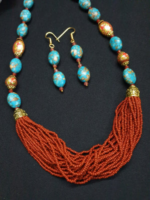 Turquoise Stone Brown Seed Bead Necklace Set