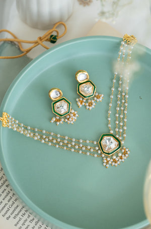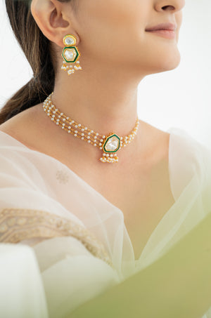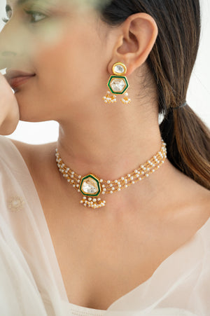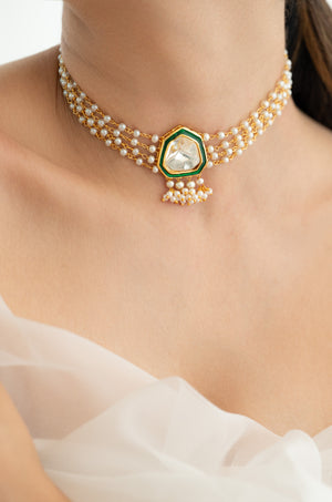 Uncut Kundan Polki Pearl Choker Necklace Set with Green Enamel