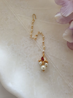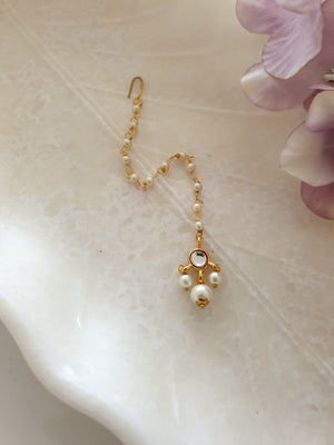 An elegant stone & pearl beaded maang tikka is the most stunning festoon. The perfect accessory for your occasion. This maang tikka is handcrafted with love