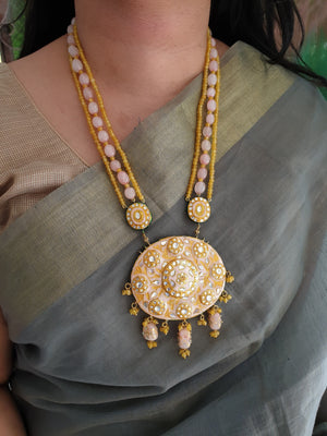Yellow and Baby Pink Beaded Meenakari Pendant Set
