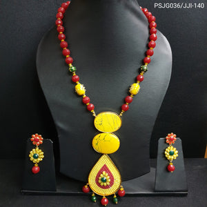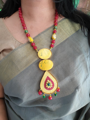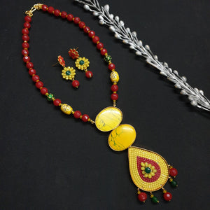 Yellow and Red Beaded Designer Pendant Set With Earrings