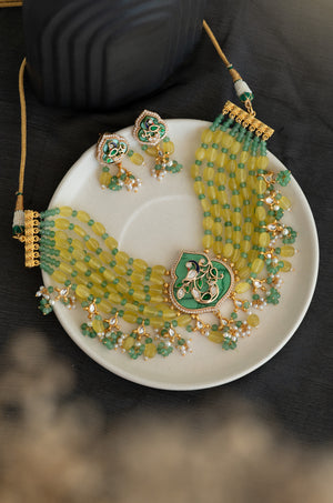 Make every occasion unforgettable with this handcrafted yellow beaded choker necklace set, complete with matching earrings. The intricate Kundan detailing, pearl accents, and rich emerald tones create a regal charm, while the multi-strand beadwork ensures a bold yet graceful look. Whether for a wedding, engagement, or festive gathering, this jewelry set promises to be the highlight of your ensemble.