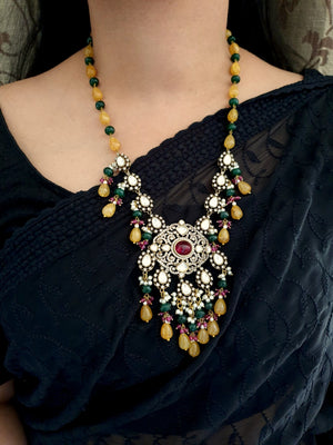 Styling: These are the perfect accessories to accentuate the elegance of your traditional outfit, furthermore, adding a perfect pop of color and edginess. The beautiful elements of the necklace go well with the saree or any Western dress. A statement necklace is enough to turn the entire outfit look amazing. It looks better with a solid color outfit or pastel outfit.