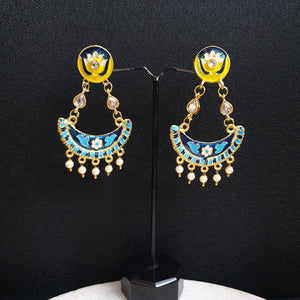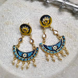 Yellow Lotus Blue Meenakari Chandbali Earrings