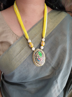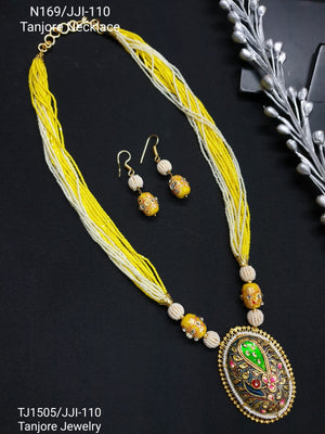 Elevate your style with our Yellow Seed Beaded Tanjore Work Pendant Set, elegantly complemented by coordinating earrings. This exquisite set showcases traditional craftsmanship and timeless elegance