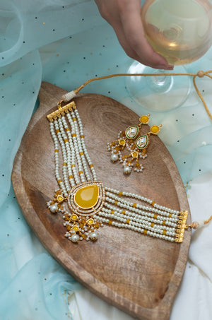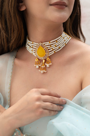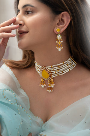 Yellow Stone Pearl Beaded Choker Necklace Set