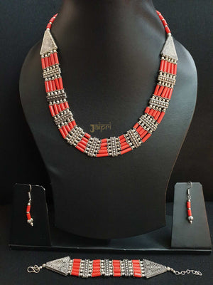 Coral Red Oxidised Necklace With Earrings and Bracelet