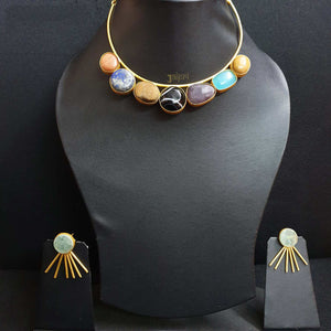 Multicolor natural Stone Gold Choker Necklace With Earrings